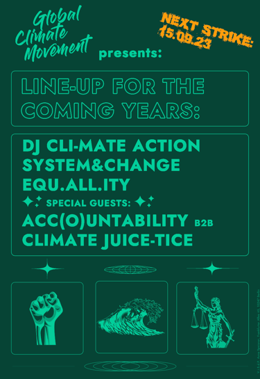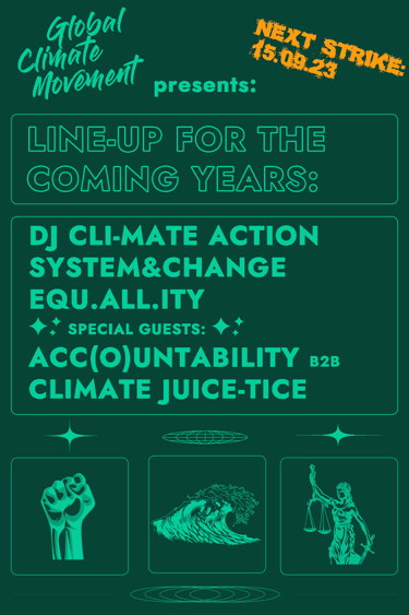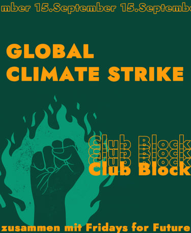 Im Rahmen einer Kampagne zur Bewerbung des Club-Blocks beim Globalen Klimastreik im September 2023 wurden verschiedene Designs entwickelt, die Berliner Clubs in ihrem Betrieb nutzen konnten, um die relevante Zielgruppe zu mobilisieren.