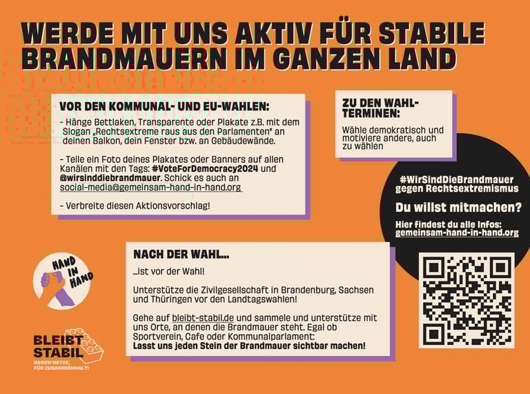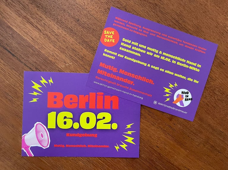 Hand in Hand ist eine zivilgesellschaftliche Initiative, die sich gegen den Rechtsruck in Deutschland einsetzt. Zum Mobilisieren für verschiedene Demos und Aktionen wurden von mir Grafiken erstellt. Printprodukte so wie auch Social Media Assets.