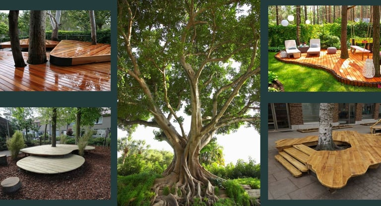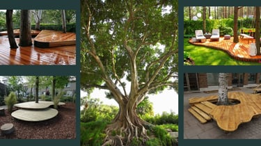 Im Fokus steht ein großer Fikusbaum, der bereits seit vielen Jahrzehnten auf dem Grundstück wächst. Er wird durch Plattformen und Ebenen als Mittelpunkt betont und eingebunden.