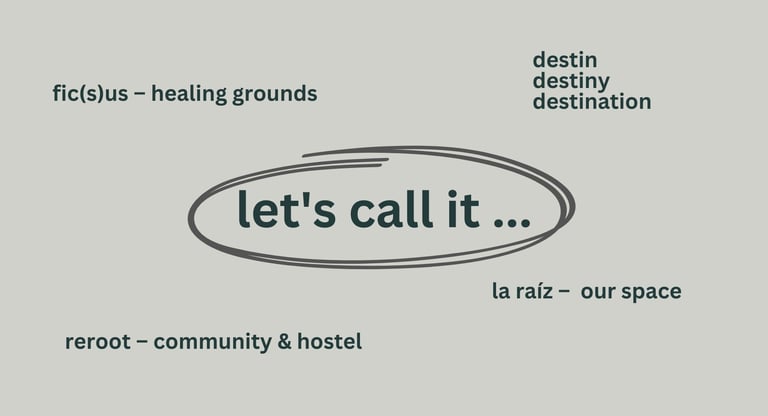 Eine Auswahl von möglichen Namen für das Hostel, die alle in Bezug zu den Besonderheiten des Grundstückes und der inhaltlichen Ausrichtung stehen.