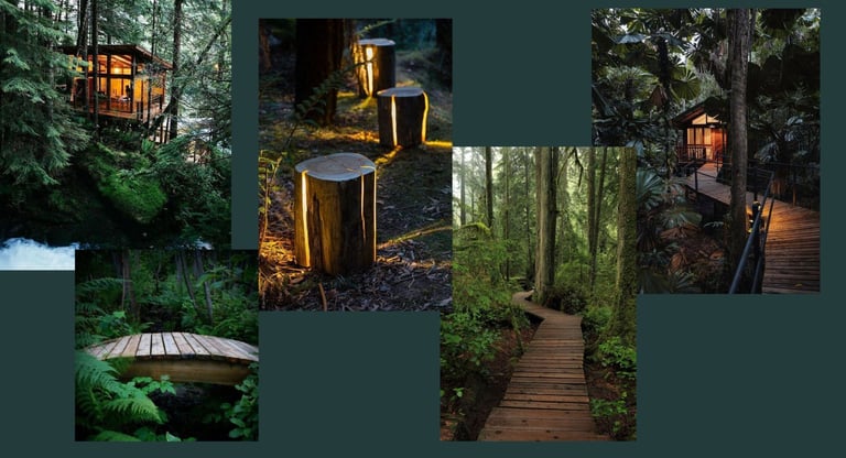 Verbindende Holz-Elemente in der natürlichen Umgebung des Hostels, warmes Licht macht neugierig zu entdecken und lässt Gäste sofort wohl fühlen.